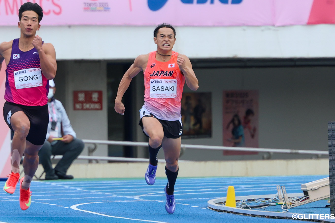 すでに専門種目の100mでは銅メダルを獲得している佐々木は「100mで力を尽くして非常に疲れている状態だった」という。カーブがきびしい1レーンだったこともあり不安もあったものの、結果は21秒98の好タイムだった。「これまでは100mの後の200mは22秒台か23秒台。それが今回は初めて21秒台を出すことができたので、これからの自信につながるレースだった」と振り返った。そして、銀メダルを獲得した山田について聞かれると、「本当に心からおめでとうと言いたい。0.02秒差は真樹のこれまでの努力の成果だと思う」と称えた。