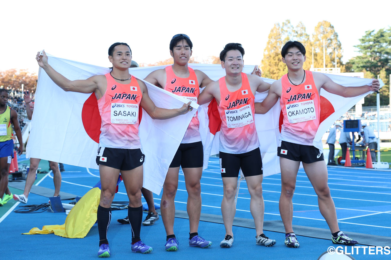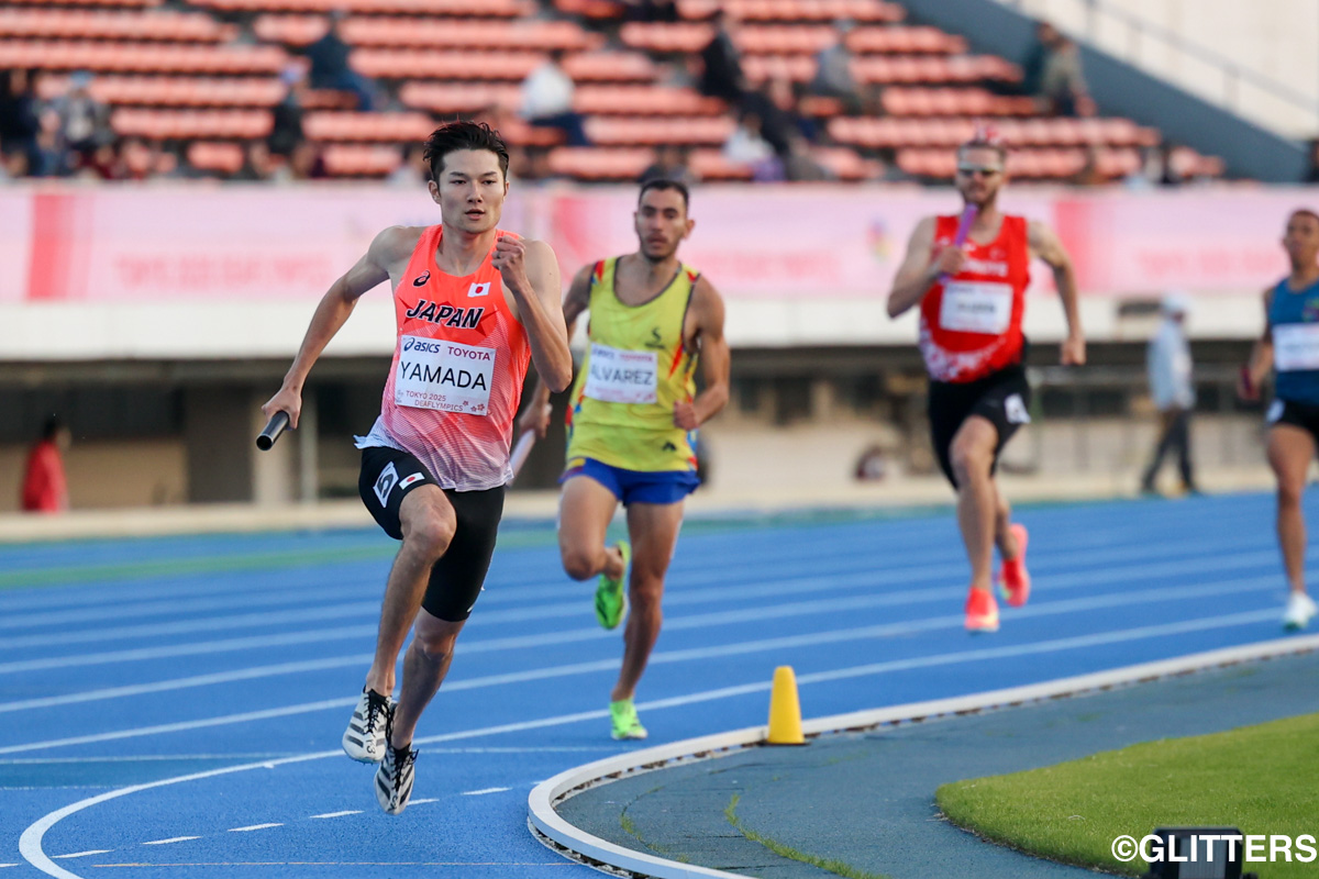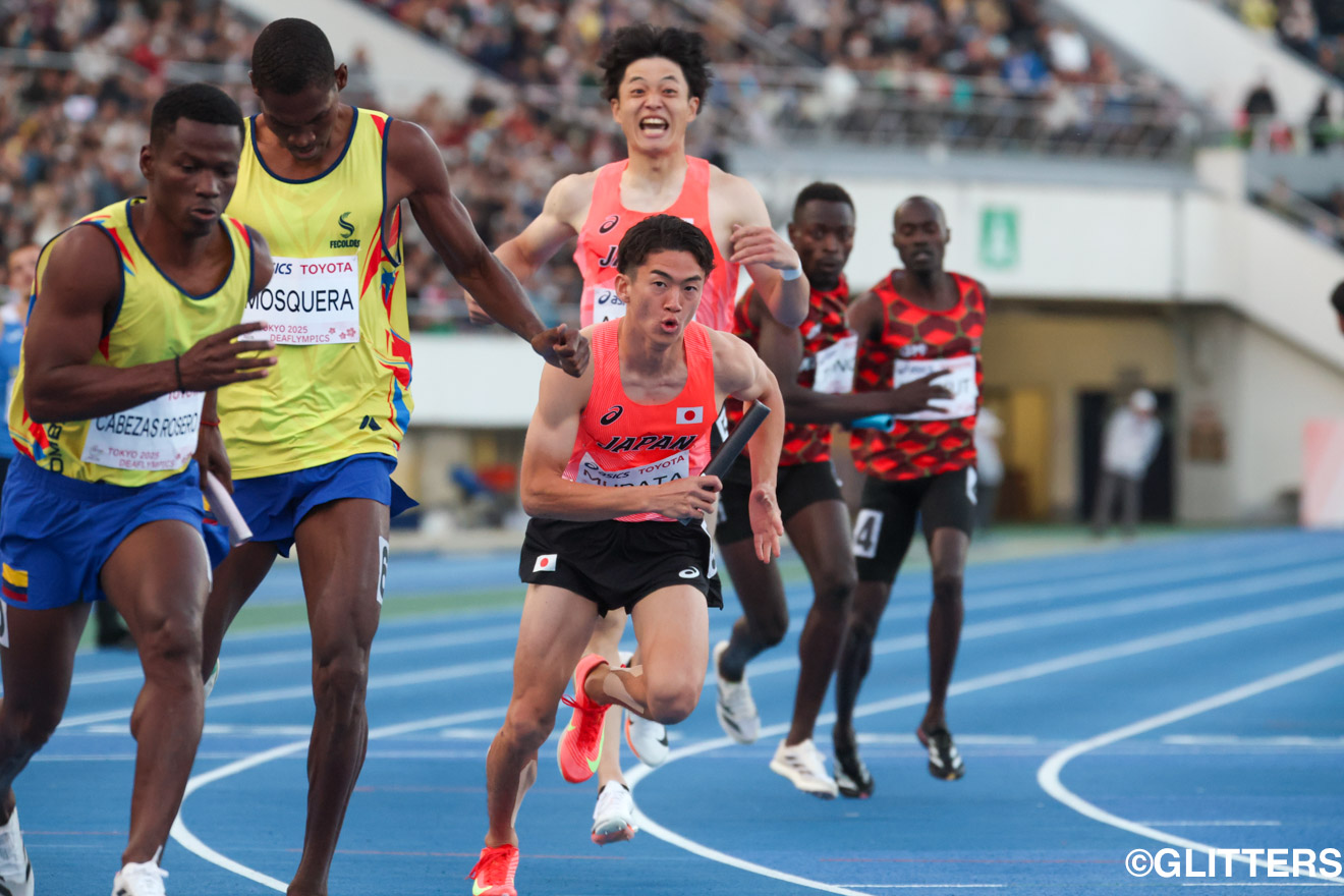 男子400mリレーでは、前日の予選を組2着、全体でも3位で決勝進出を決めた4人がそのまま決勝のメンバーとなった。まずは岡本隼が好スタートを切り、第2走者の冨永幸佑、第3走者の坂田翔悟もしっかりとバトンをつないだ。レースは第3走者の時点でメダル争いは日本、アメリカ、コンロビアの3カ国に絞られていたが、第3走者から第4走者へのバトンの受け渡しがうまくいかなかったコロンビアが脱落。日本とアメリカの一騎打ちとなり、観客で埋め尽くされたホームストレートを2人のアンカーが疾走した。