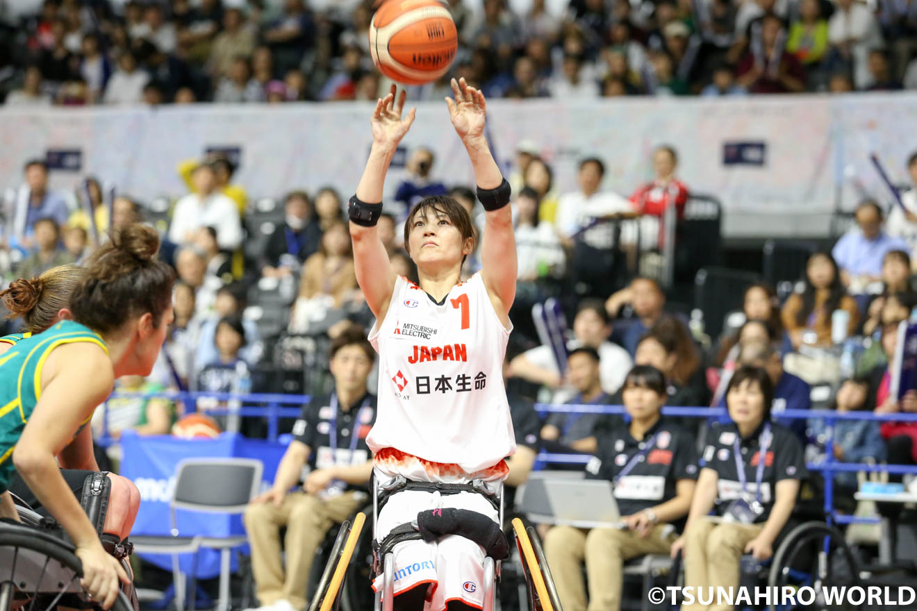 オーストラリアとの2戦目、第1Qから日本はオーストラリア相手に大きくリードする。「前半は今までで1番良かった」とキャプテン藤井郁美(4.0)が話すように、ディフェンスでオーストラリアに対し強くプレッシャーをかけ、日本に流れにもってきた。前半、チーム最多6得点を決めたローポインターの萩野真世(1.5)と柳本あまね(2.5)の見事な連携と、網本、財満いずみ(1.0)の得点で28-12とオーストラリアに16点の差をつけ前半を折り返した。