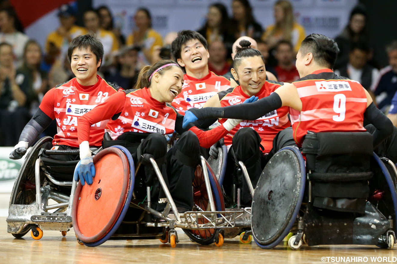 オーストラリアボールでスタートしたが、ローポインターにボールが渡った瞬間に池崎や池がすかさずボールを奪いに囲い、ヘルドボールで所有権が日本に。池崎のアシストで乗松がトライを決め、2点差としたが、オーストラリアのクリス・ボンド(3.5)に池崎が出したパスをカットされ3連続トライで49-50と逆転される。残り3分に相手のパスが相手チームの頭にあたりコート外に転がり、日本ボールとなり、56-55で逆転。1点リードしたまま62-61で初めて世界一の頂点に立った。