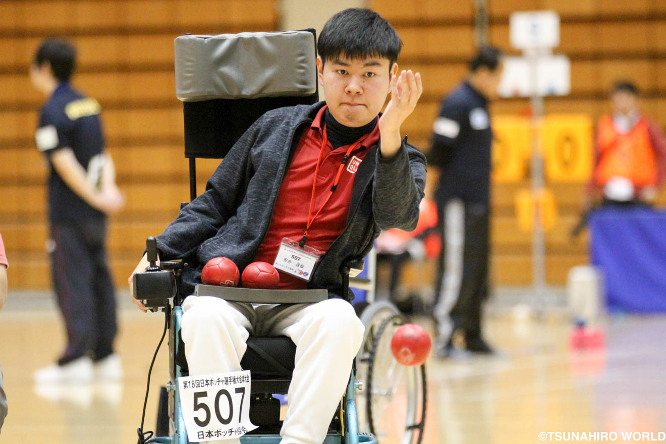 第18回日本ボッチャ選手権大会本大会は、11月26日、27日にいしかわ総合スポーツセンター(石川県金沢市)で行われ、第17回大会の上位成績者と各予選を勝ち抜いた選手が全国から集まった。ボッチャは、重度脳性麻痺者もしくは同程度の四肢重度障害を持っている者のために考案されたスポーツで、白いジャックボール(目標物)に向けて赤青のボールを投げ合い、点数を競い合う。リオパラリンピックでは、火の球ジャパンが団体戦で銀メダルを獲得した。クラスはBC1からBC4、オープン競技として座位と立位のクラスが2つある。