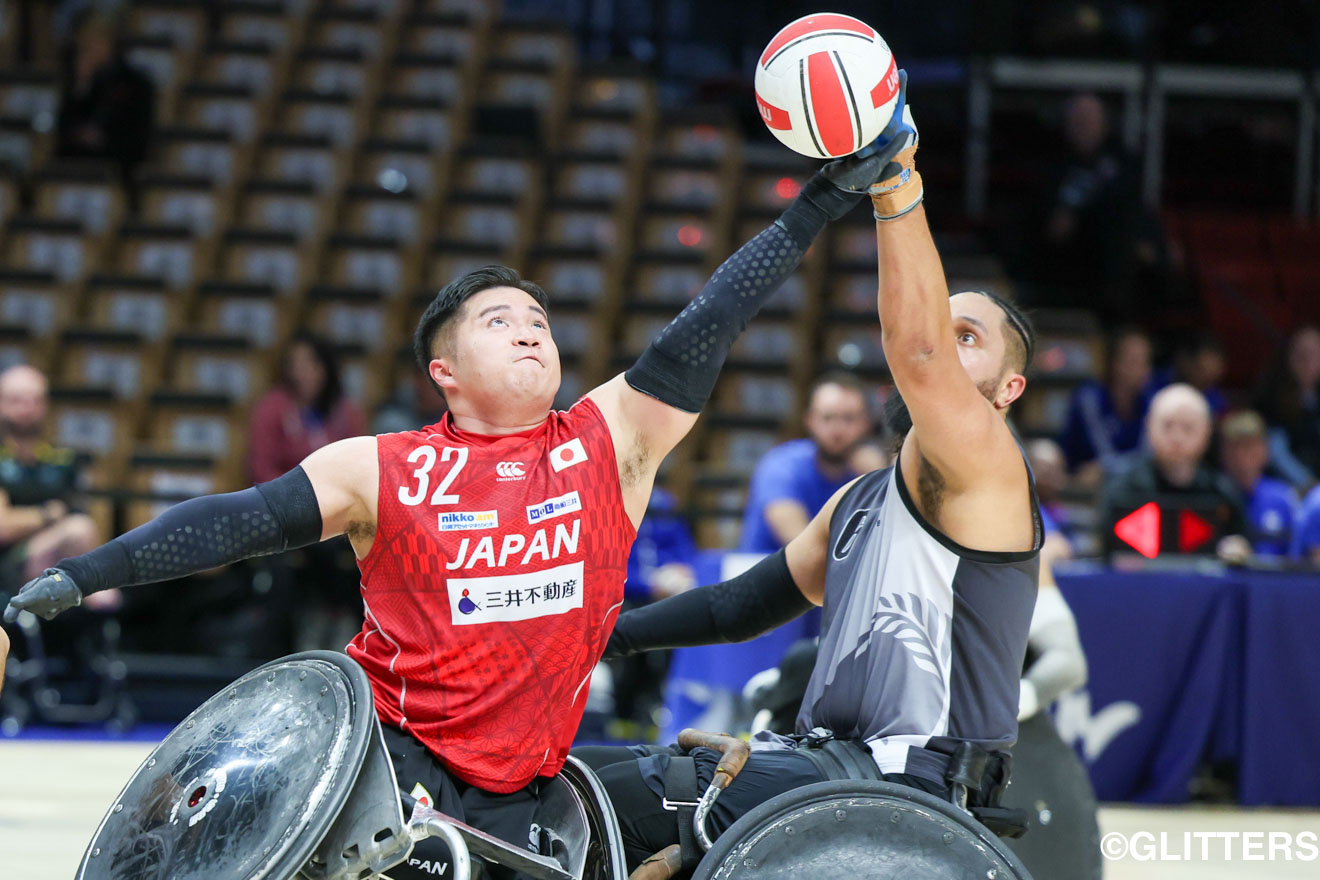 日本は、スターティングラインナップに、ハイポインター2人とローポインター2人によるハイローラインを起用し、今大会がフル代表レベルの国際大会デビューとなる草場龍治も名を連ねた。初戦とあってか硬さの見えた立ち上がり、“日本対策"をして臨んだニュージーランドに、インバウンド後のボールを奪われ連続得点を許してしまう。すぐにセカンドラインナップを送り込んだ日本は、マンツーマン・ディフェンスで相手のパスコースをふさぎ、オフェンスでは着実にトライを取って流れを取り戻すと、第1ピリオドを9-9の同点で終えた。