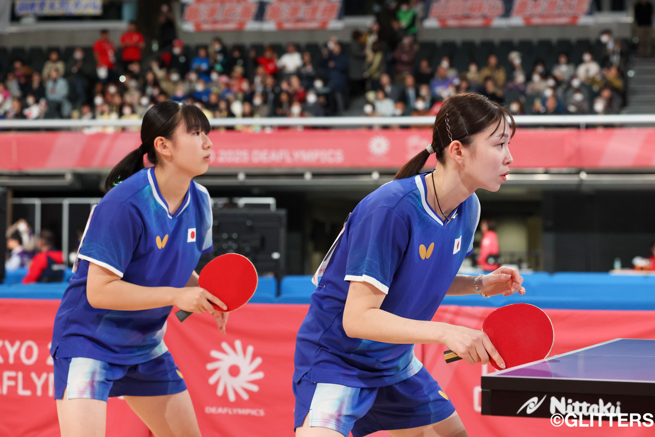 一方、デフリンピックではこれまで4大会で8個(銀3、銅5)のメダルを獲得している亀澤理穂と初出場の木村亜美は、初戦(2回戦)は貫禄のストレート勝ち。しかし、「力を合わせて中国を倒して金メダルを取りに行く」と語っていた準々決勝は、逆にストレート負けを喫した。1ゲーム目は先にゲームポイントとしたものの、逆転されて落とすと、2ゲーム目以降も競り負け、1ゲームも取ることができずにメダルを逃した。「(前日の混合ダブルスから)2日続けてメダルを逃すという結果となったが、これが自分の実力。中国の方が力が上だった」と亀澤理。木村は「デフリンピックの日本代表に内定してから1年以上、2人で練習に励んできた」と言い、悔し涙を流しながらも「最後まで諦めずに戦えたのは良かったと思う」と声を絞り出すようにして語った。