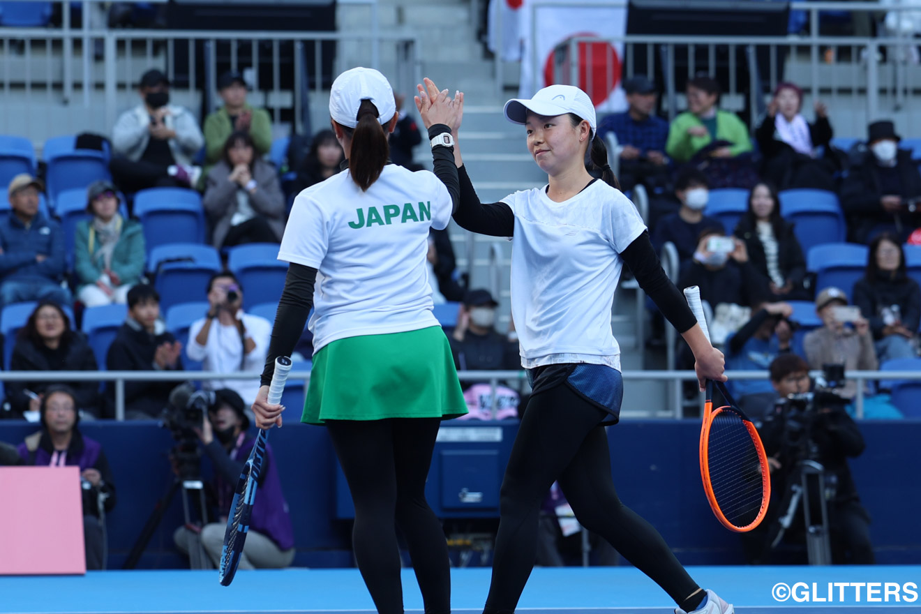勝利を決め、ハイタッチを交わす菰方里菜(右)と鈴木梨子(左)。最後まで息の合ったプレーを見せた