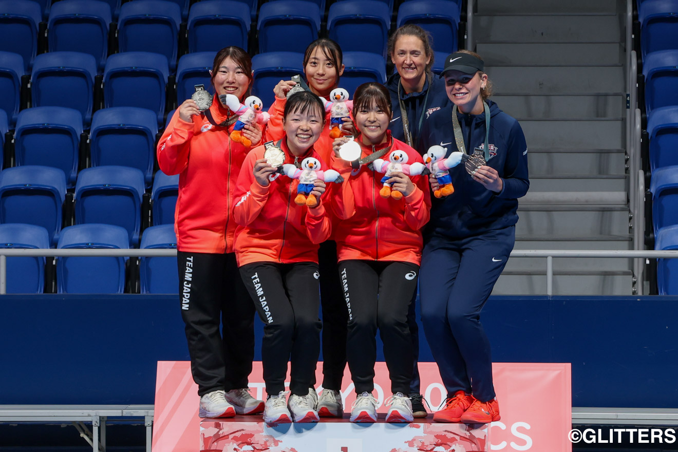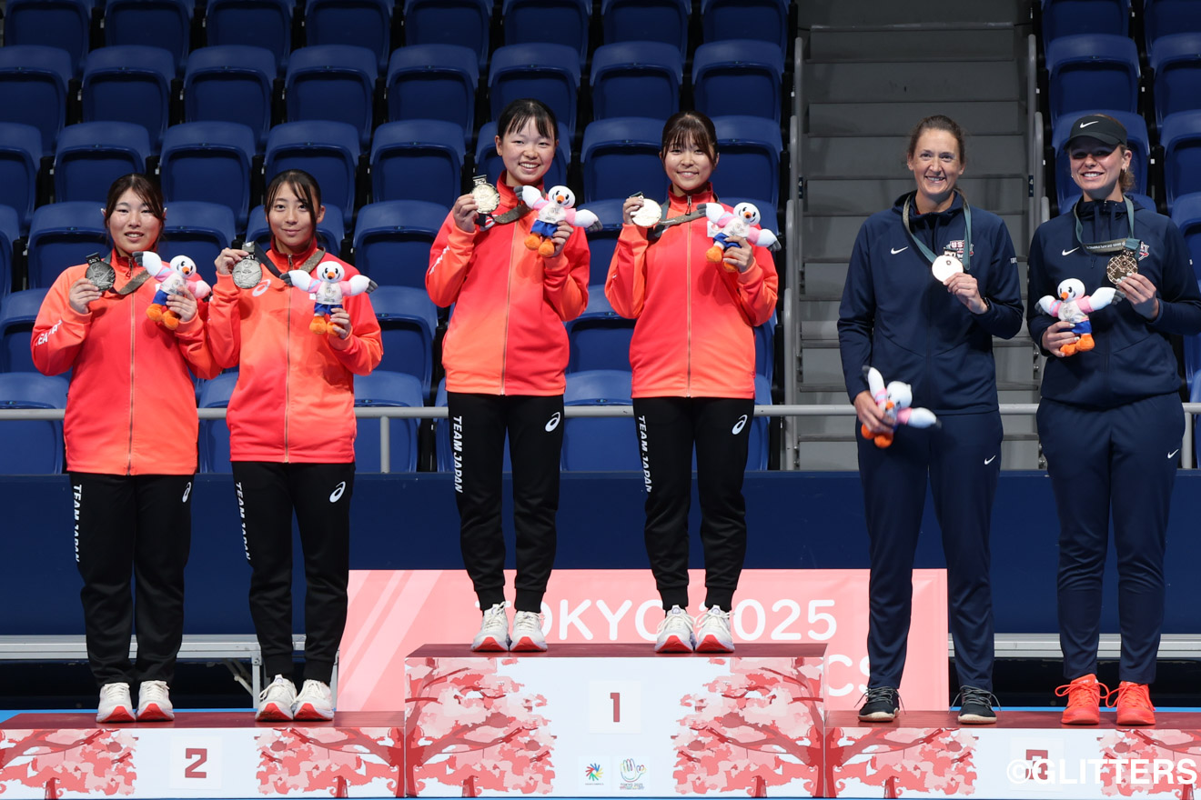 女子ダブルス表彰式で、金メダルの菰方・鈴木組(中央)と銀メダルの宮川・杉本組(左)が満面の笑みを見せた