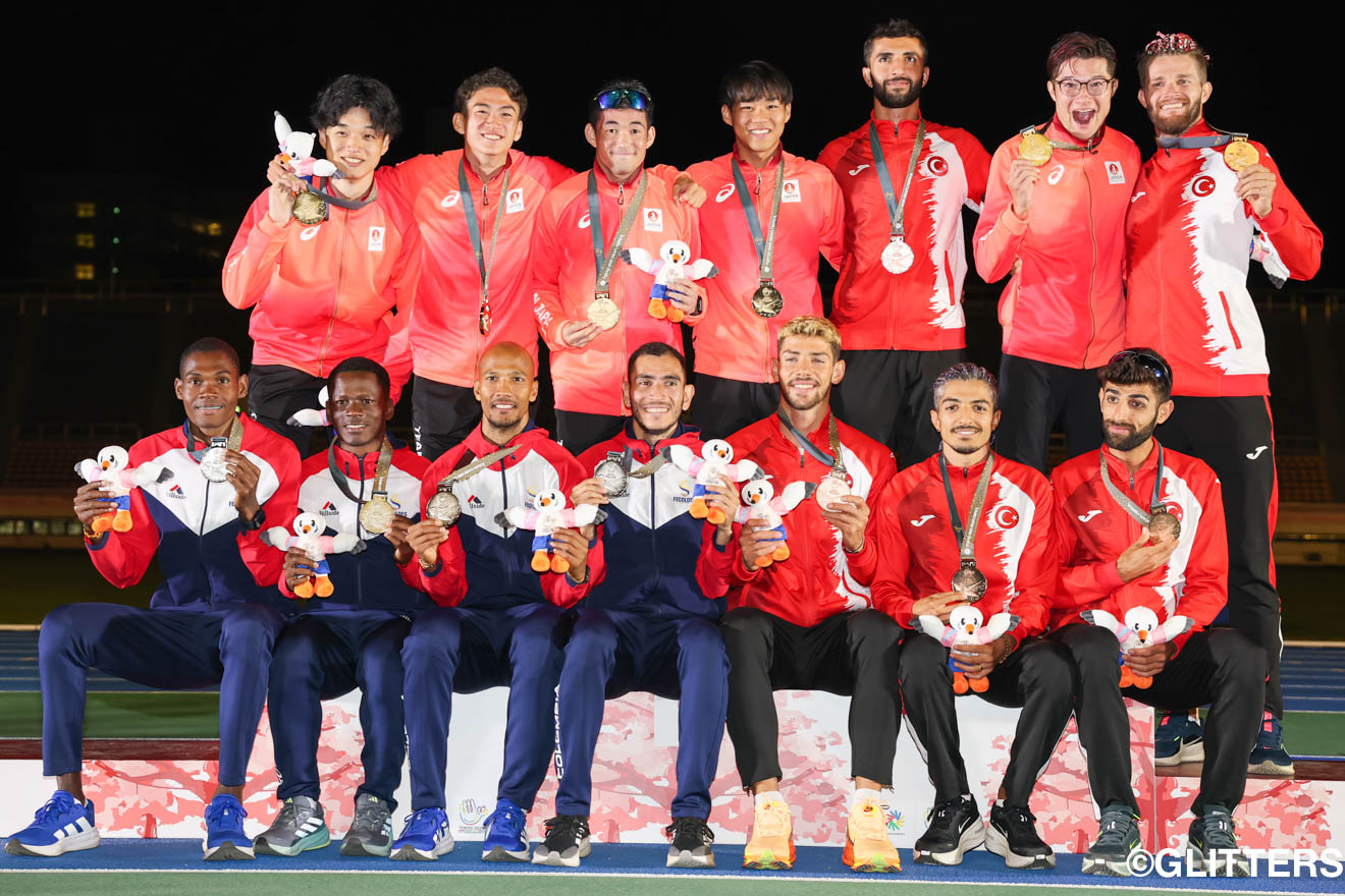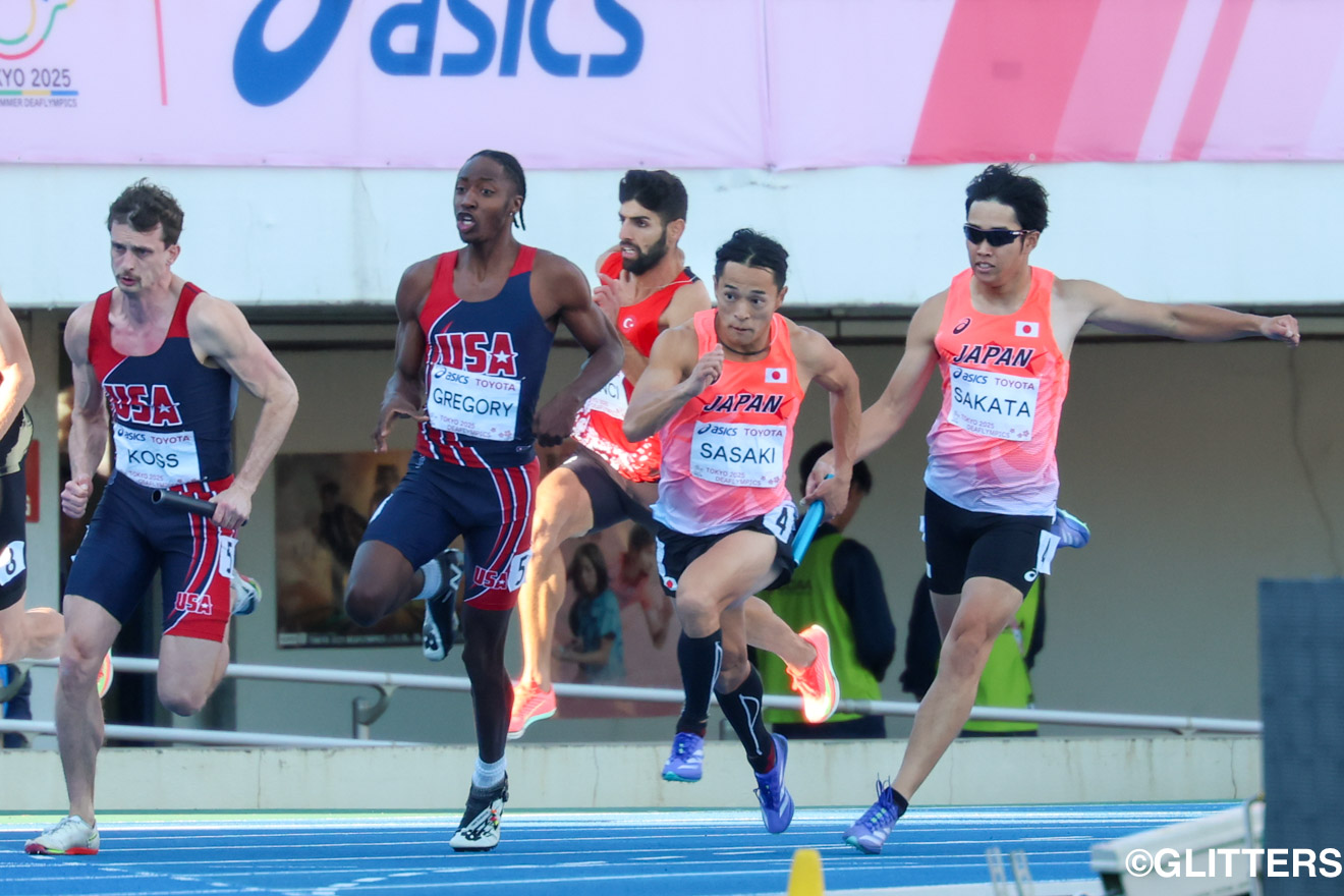 男子400mリレーでは、前日の予選を組2着、全体でも3位で決勝進出を決めた4人がそのまま決勝のメンバーとなった。まずは岡本隼が好スタートを切り、第2走者の冨永幸佑、第3走者の坂田翔悟もしっかりとバトンをつないだ。レースは第3走者の時点でメダル争いは日本、アメリカ、コンロビアの3カ国に絞られていたが、第3走者から第4走者へのバトンの受け渡しがうまくいかなかったコロンビアが脱落。日本とアメリカの一騎打ちとなり、観客で埋め尽くされたホームストレートを2人のアンカーが疾走した。