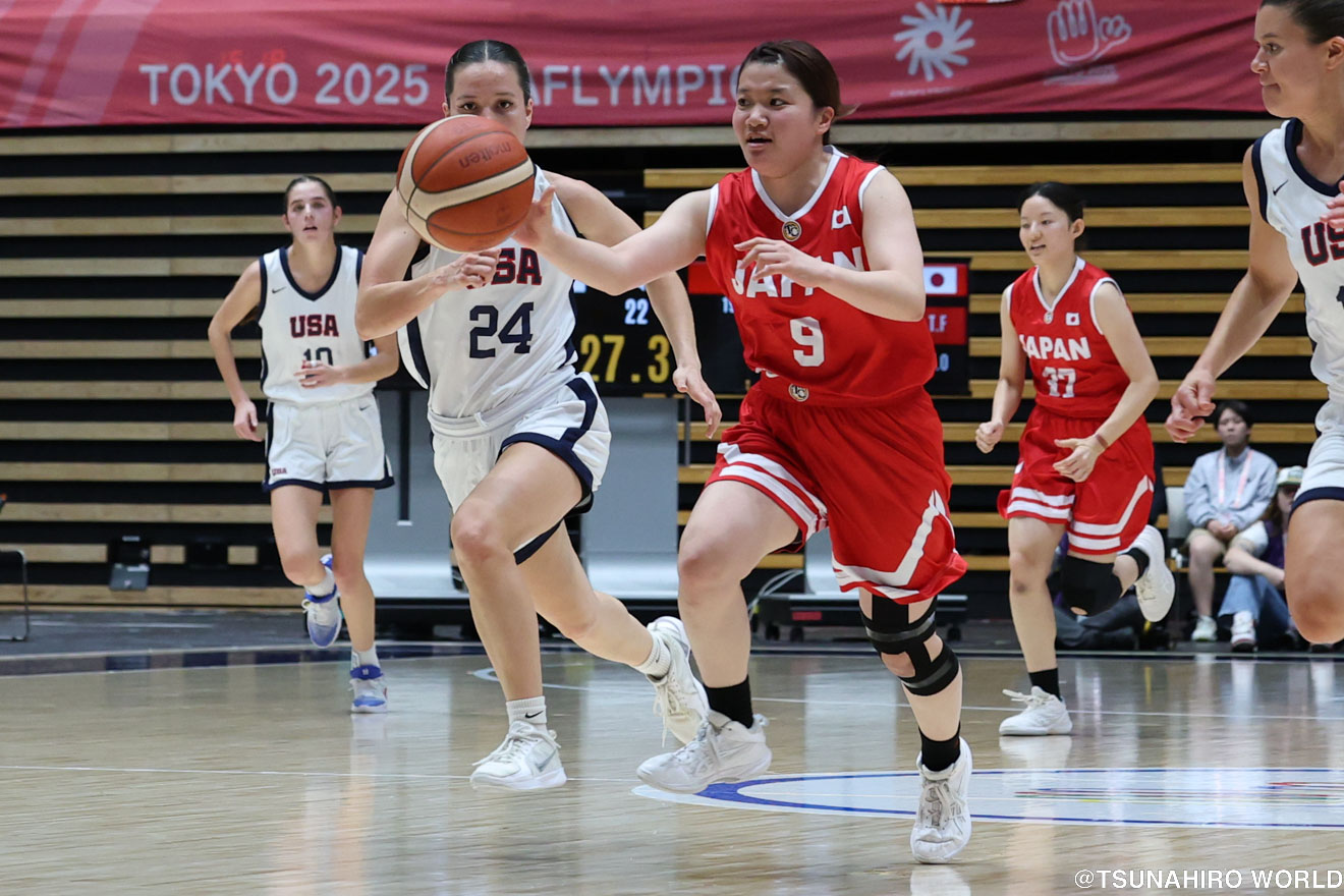 日米によるファイナルは、まさに死闘となった。第1Qの序盤、日本は「(アップの)シューティングの時から今日は調子がいいことがわかっていたので、ボールを託されたら思い切って打っていこうと決めていた」という小鷹実春が早くも3ポイントシュートを炸裂。さらにはダブルチームを成功させるなど“攻めのディフェンス"で流れを引き寄せた。中盤にはアメリカに3ポイントシュートなどで3連続得点を奪われて逆転を許すも、終盤にも小鷹の3ポイントが決まり、12-11と再びリード。小鷹はディフェンスでも魅せ、ペイントエリアでアメリカのシュートをブロック、さらにはスティールでボールを奪った小鷹はそのまま自ら速攻で走り、ドリブルシュートを決めるなどして観客を魅了した。